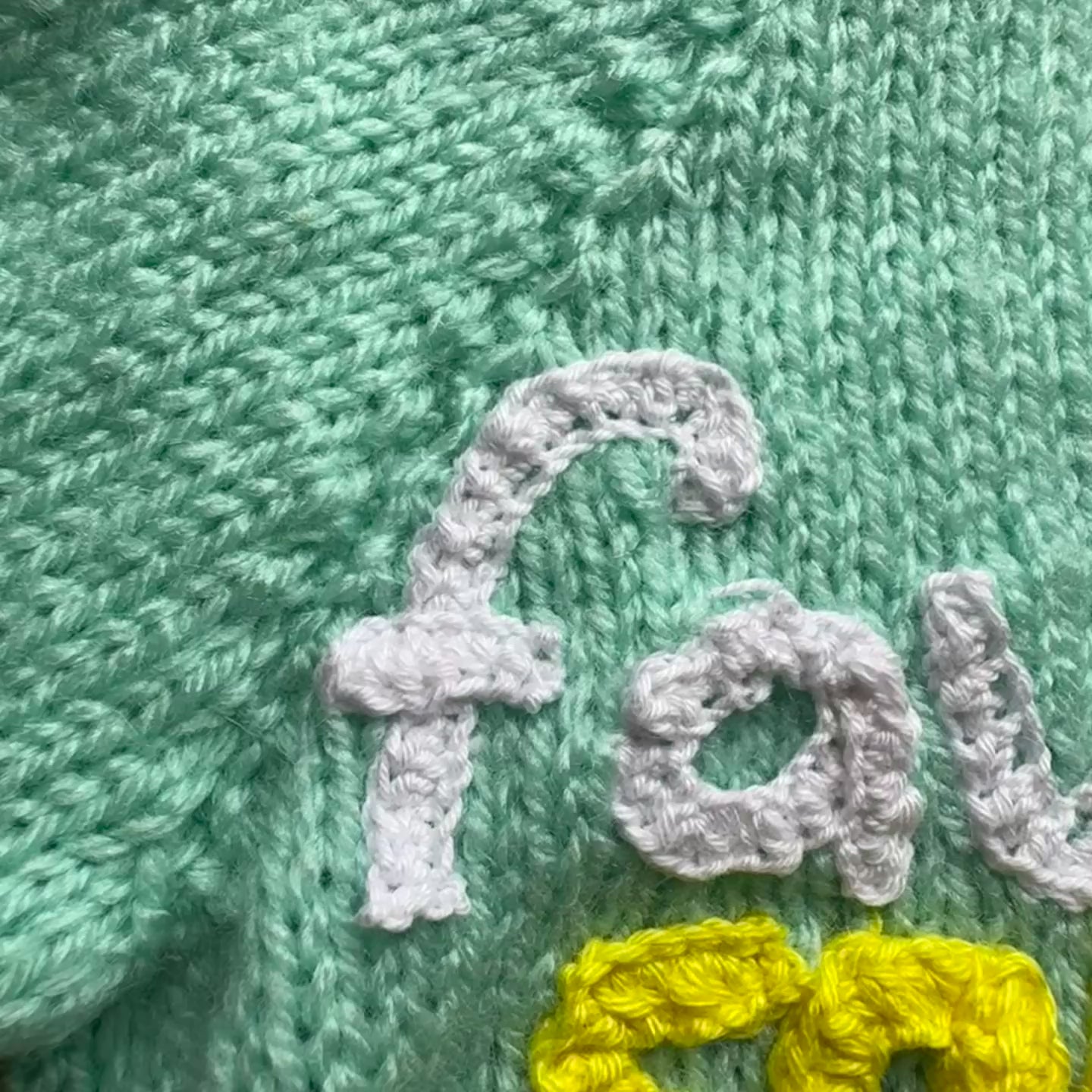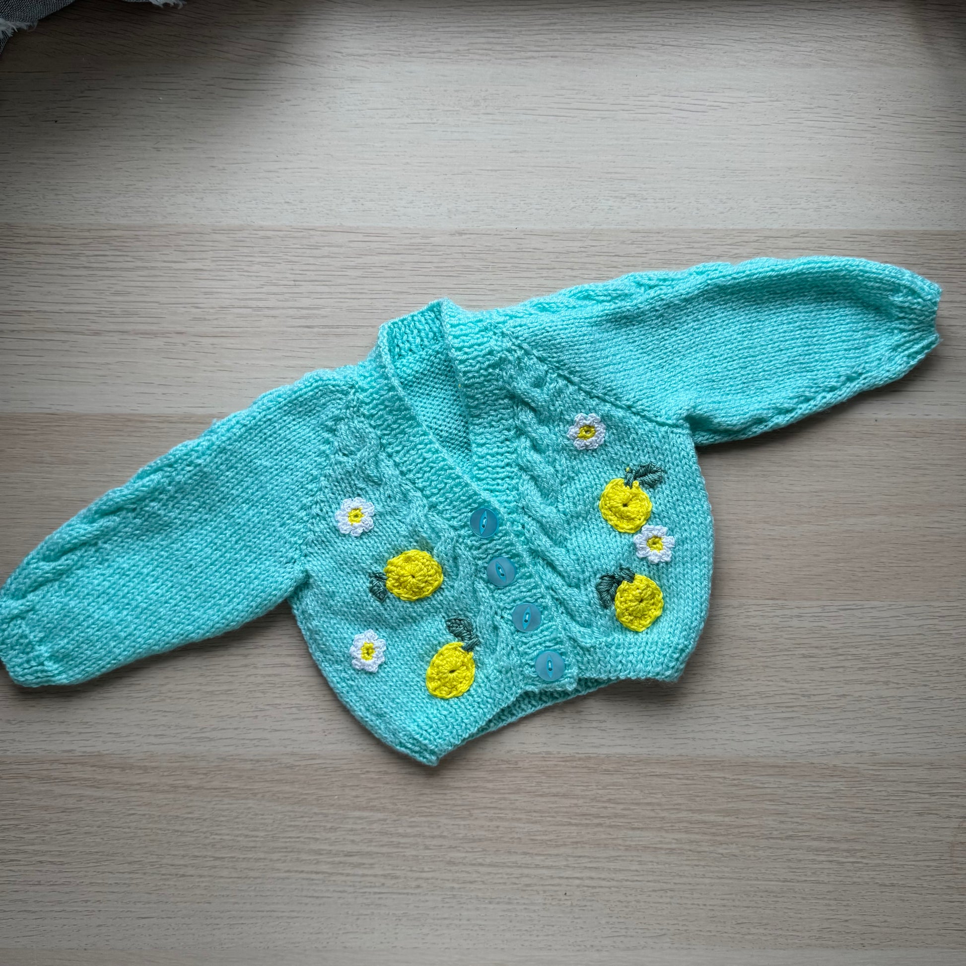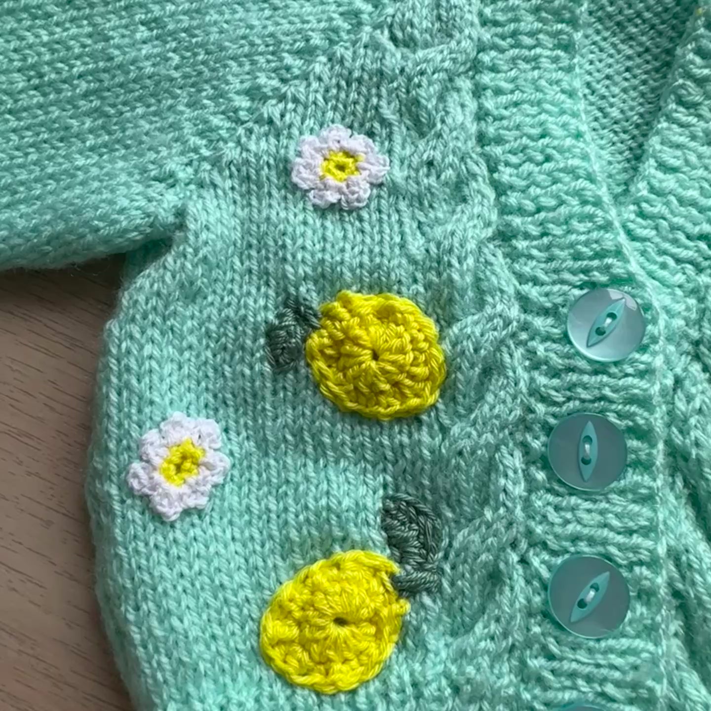 Hand knitted cable knit cardigan in size 0-3months. Embellished with hand crochet appliqués in 100% cotton yarn.