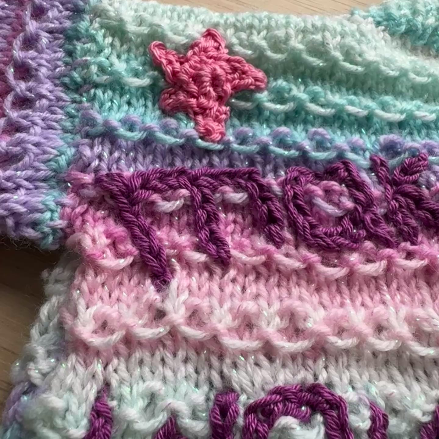 Hand knitted cardigan in size 0-3 months, embellished with hand crochet appliques.