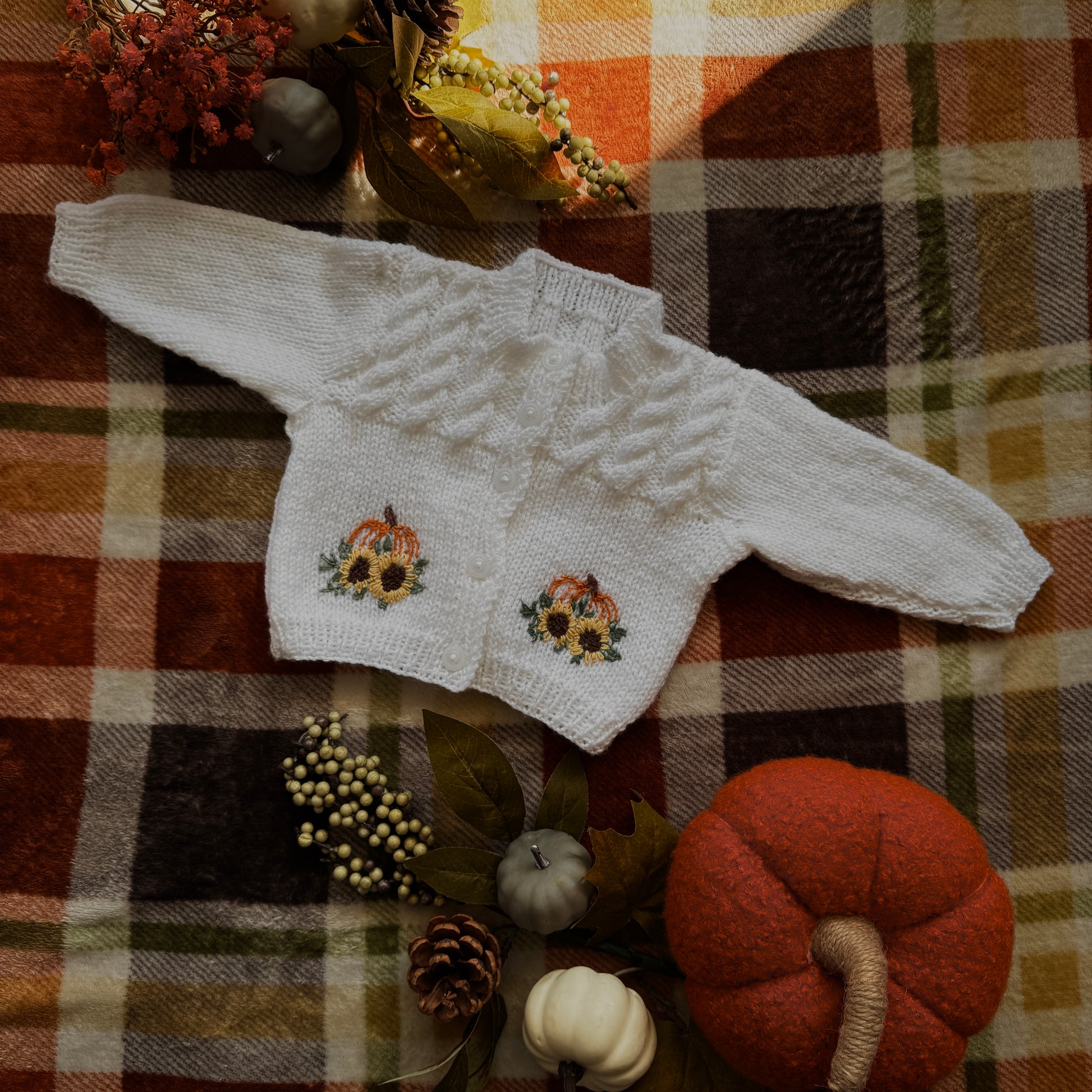 Hand knitted cable knit style cardigan in white embroidered with thin cotton threads to create a more detailed design.