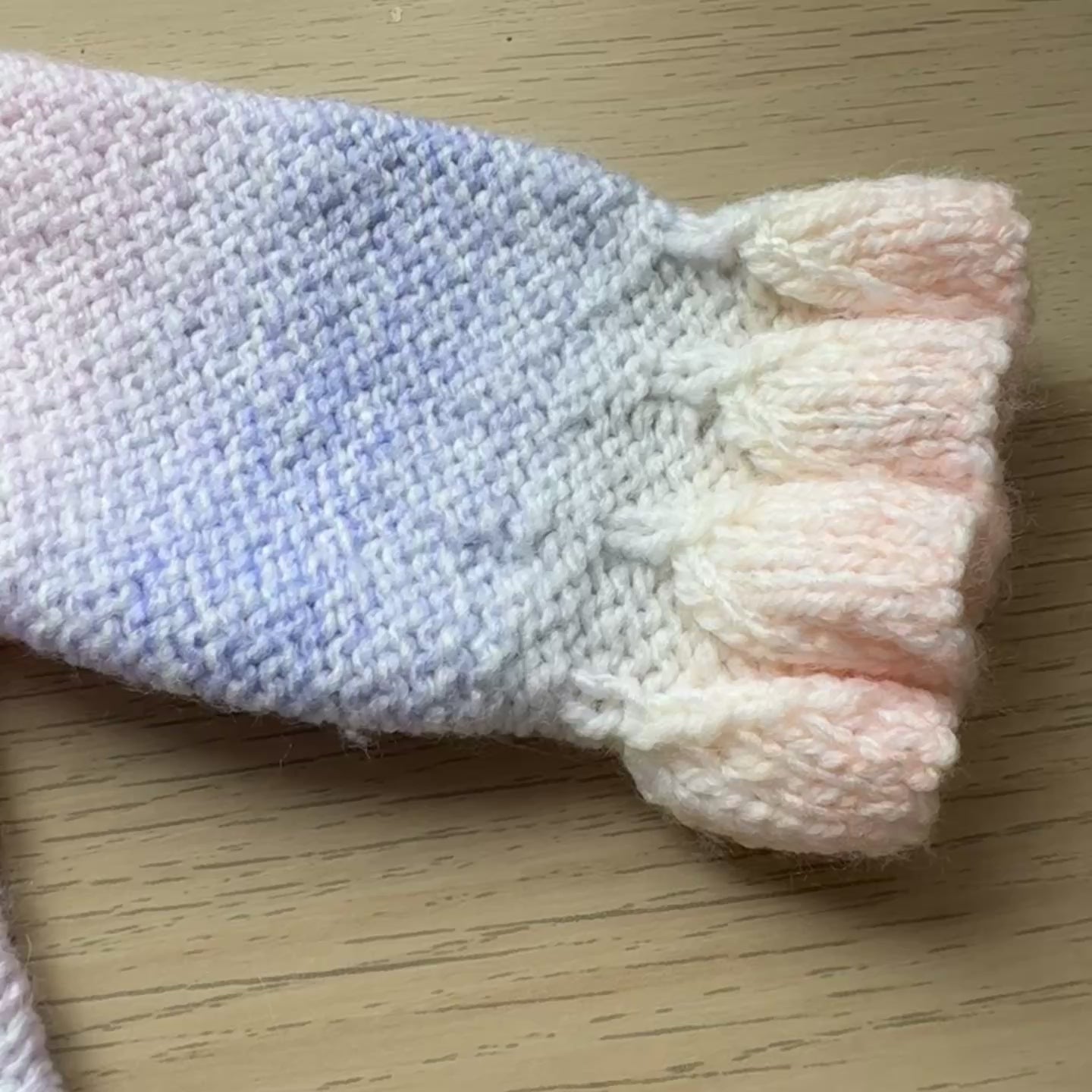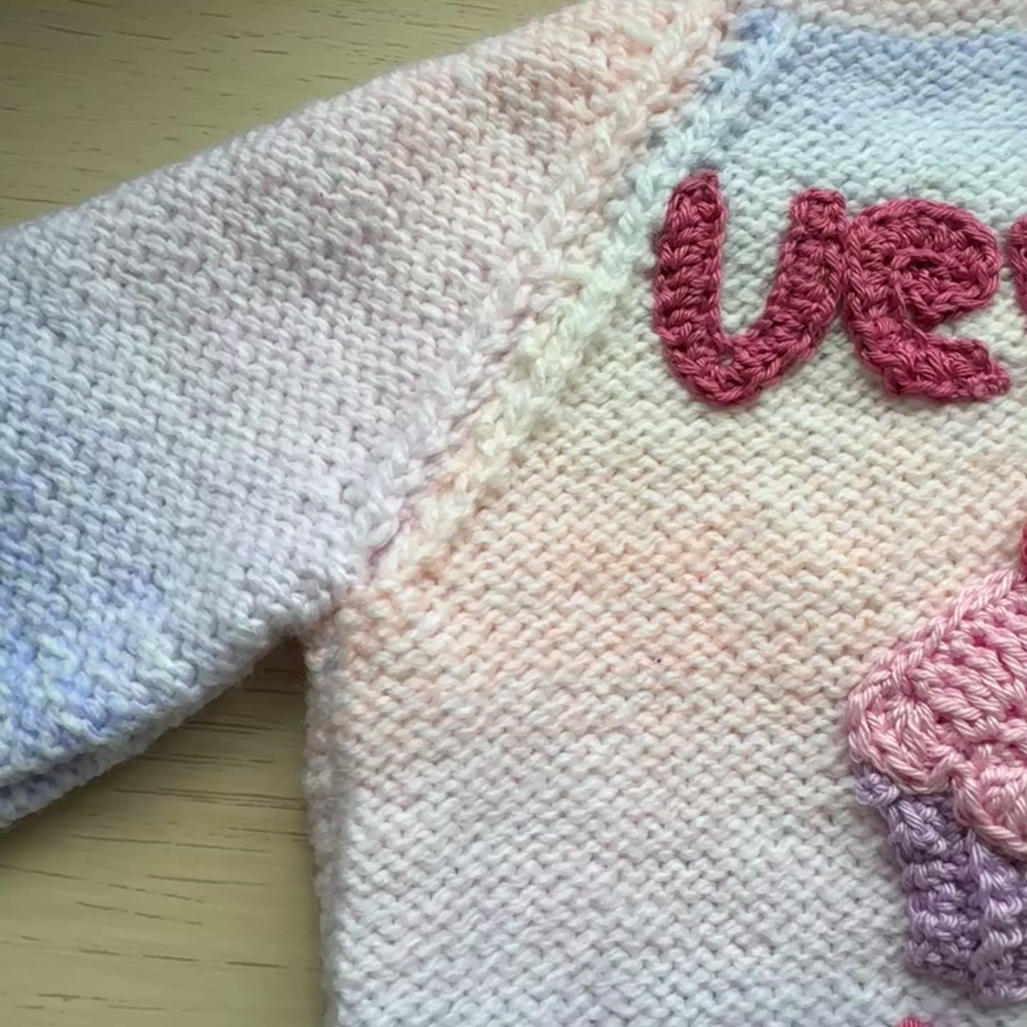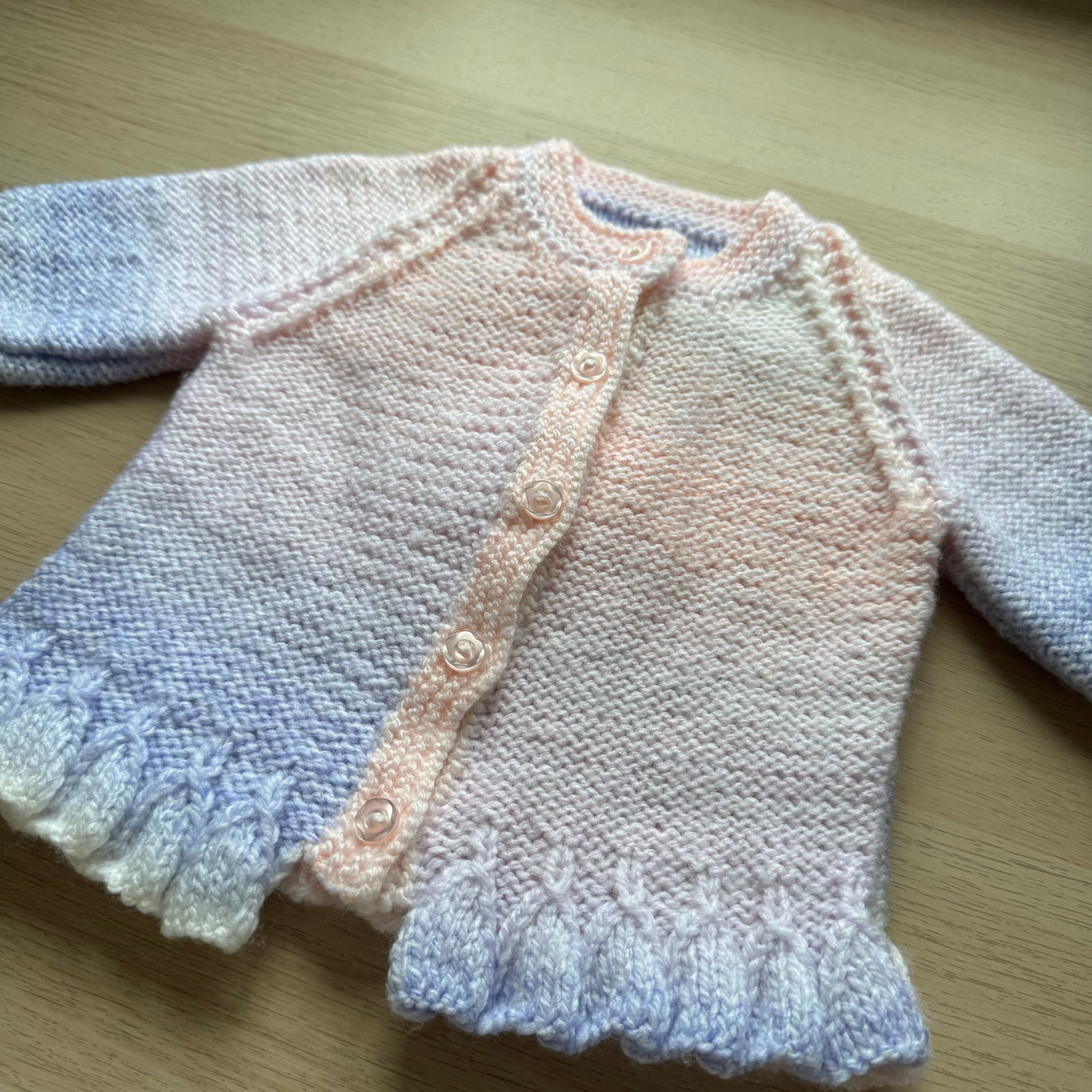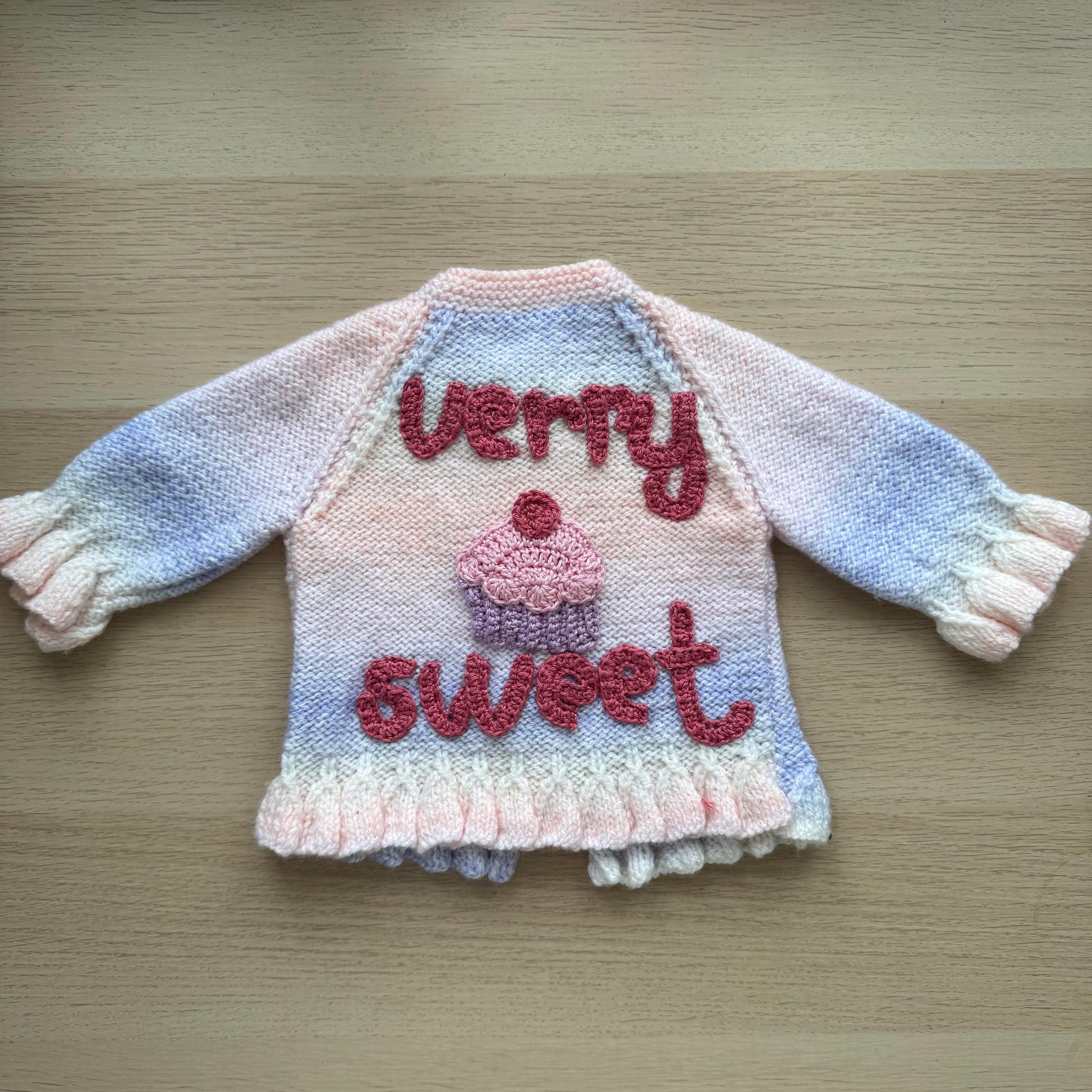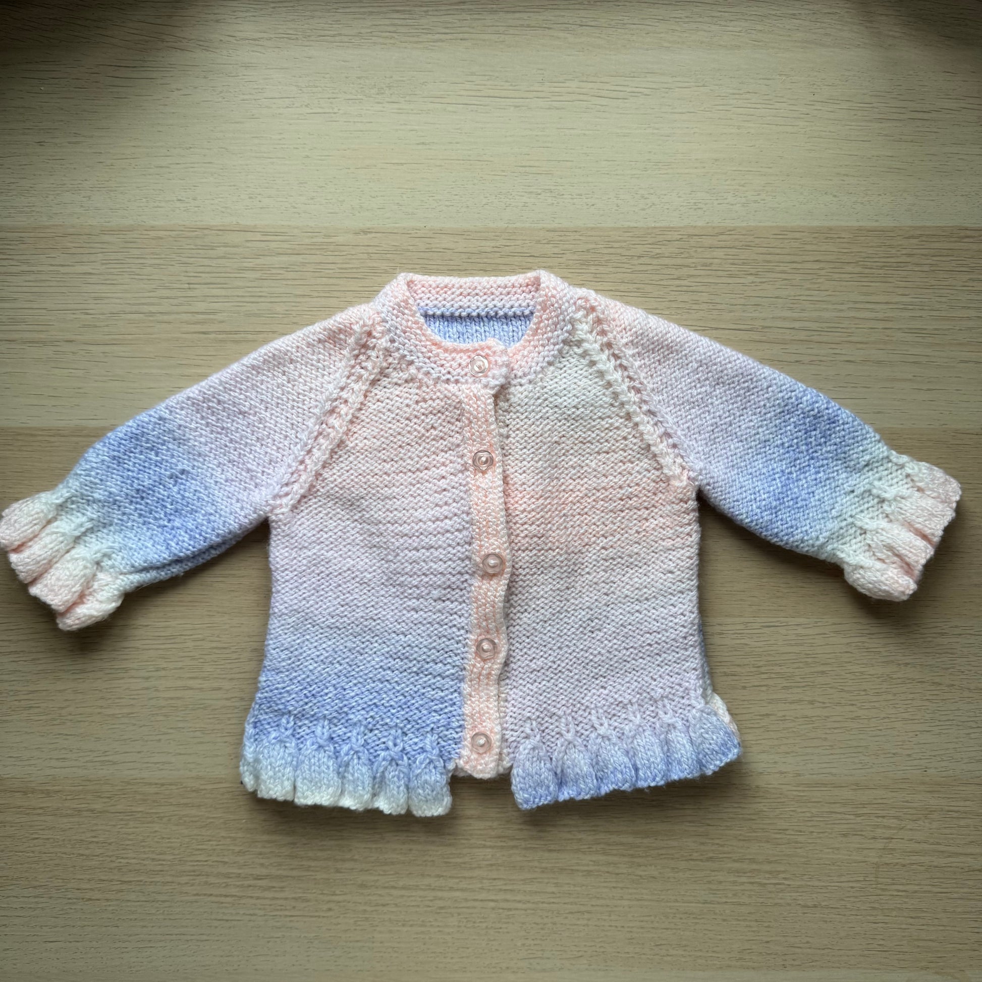 Ruffle hem and sleeve style hand knitted cardigan in size 6-9 months. Embellished with hand crochet appliqués using 100% cotton yarn.